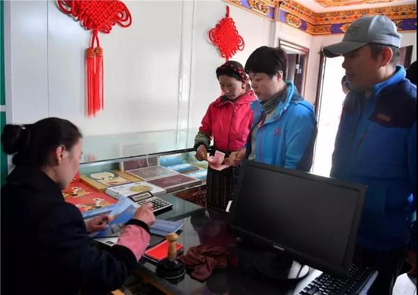扎什伦布寺,来自香港的游客在展示中国邮政设计制作的景区门票。西藏邮政以深度融合西藏旅游文化、西藏民俗文化和邮政文化为核心,以邮政先进的网络、技术为支撑,服务景区,服务游客,融入西藏旅游发展热潮,助推西藏旅游经济的发展。