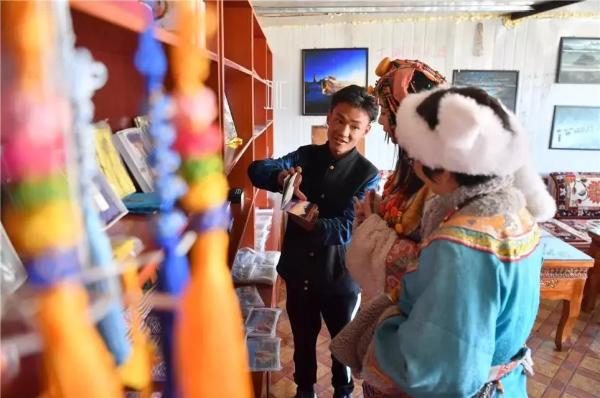 西藏自治区纳木错自然保护区邮局,旦增洛珠(左)正在给游客介绍旅游产品。自农村电商工作开展以来,西藏邮政已在全区各地(市)多个邮政营业网点、便民服务站、小商超店、旅游景点等地建立“邮掌柜”、邮乐购、邮乐网、天上西藏E邮等网上购物和销售系统。