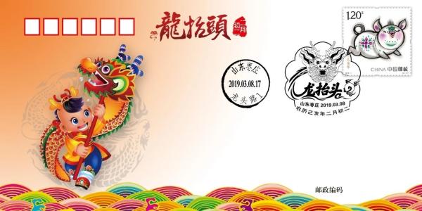 山东省枣庄市邮政部门将于3月8日(农历二月初二)发行“龙抬头”纪念封1枚(见图),图案以舞龙的儿童为主图。同时,启用纪念邮戳1枚,并加盖颇具生肖特色的“山东枣庄·龙头路”邮政日戳。