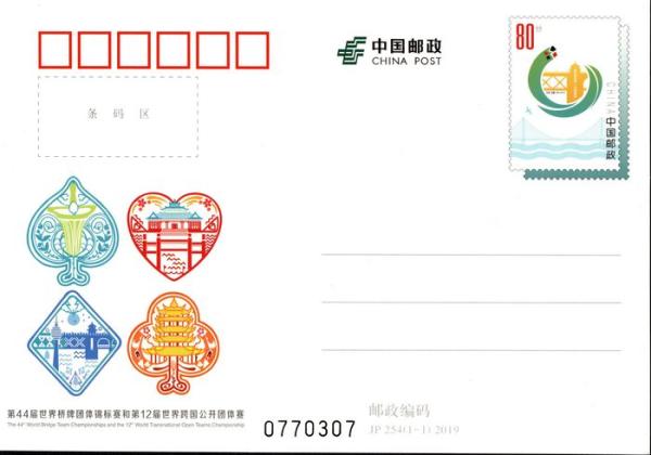 中国邮政定于2019年9月14日发行《第44届世界桥牌团体锦标赛和第12届世界跨国公开团体赛》纪念邮资明信片1套1枚。详情如下: