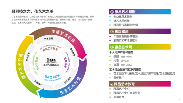 董玉文从两个方面对雅昌的重点业务及数字化特色进行了精彩的展示。一是介绍了雅昌四大业务板块的定位及其产品服务。"雅昌印刷"板块将个性化定制与满载工匠精神的工艺相结合打造精品;"传给雅昌"板块为消费者提供个性化智能影像传输的解决方案;"雅昌艺术网"板块搭建起中国最大的互联网综合性艺术服务平台和当代艺术品信息社交交易平台;"雅昌艺术教育"板块以"服务专业,公益大众"为宗旨,致力于文献专题研究和普及艺术教育。
