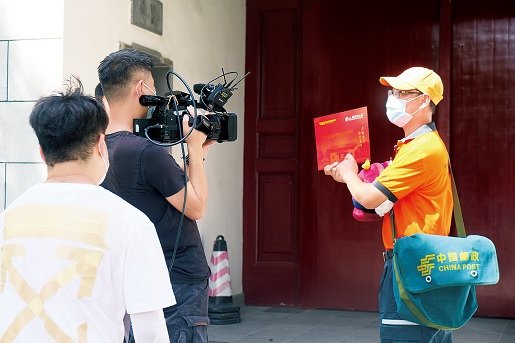 日前,中央广播电视总台央视频和中国邮政分别在北京、上海和四川阿坝开展了“高考录取通知书驾到”的直播。从繁华的城市到偏远的乡村,邮政投递员秉承“人民邮政为人民”的宗旨,克服各种困难,保证将录取通知书及时、准确、安全送到考生手中。据悉,中国邮政和央视频还联合推出高考录取通知书寄递在线查询服务系统,考生可在线查询录取通知书的寄递情况。图为央视频摄制组、上海邮政投递员在39摄氏度高温下直播录取通知书投递。