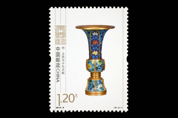 此套邮票是故宫主题邮票特展的重要展品之一。其中,第2枚邮票上的花觚为明代皇室书房陈设品,侈口长颈,鼓腹上出鎏金四戟,线条挺直,下部起双弦唇线,足呈覆钟式,色彩搭配素雅,属明代皇家掐丝珐琅文房插花具。此器早年流落海外时曾被改成台灯,底部被打孔走线,原本的“景泰年制”四字款中的“泰”和“年”两个字残缺。