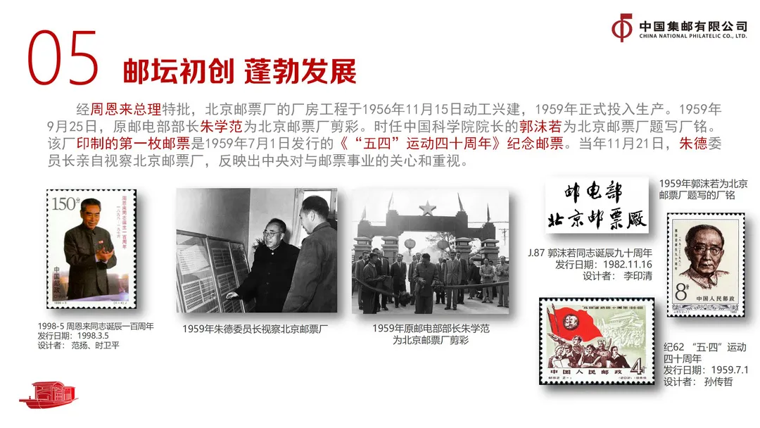 二是邮票传递情感。抗美援朝战争中,每当志愿军战士们看到信封上印有五星红旗的邮票时都备感亲切、备受鼓舞。在战场上,这些信函就是他们与祖国的情感纽带。三是邮坛蓬勃发展。印制独立自主,北京邮票厂的建成投产结束了中国邮票印制技术长期受制于外国的历史;设计百花齐放,《金鱼》《菊花》《蝴蝶》《黄山风景》《牡丹》“五朵金花”铸就了邮坛经典;队伍人才辈出,社会名家积极参与邮票设计,自己的邮票设计队伍逐渐形成。张仃、孙传哲、周令钊、黄永玉、邵柏林等是其中的代表。