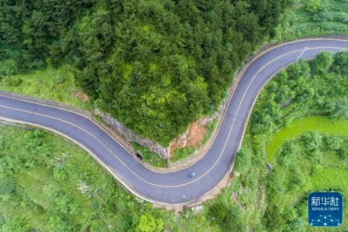 在山西省壶关县大峡谷镇,赵月芳骑行在送件的路上(7月13日摄,无人机照片)。新华社记者 杨晨光 摄