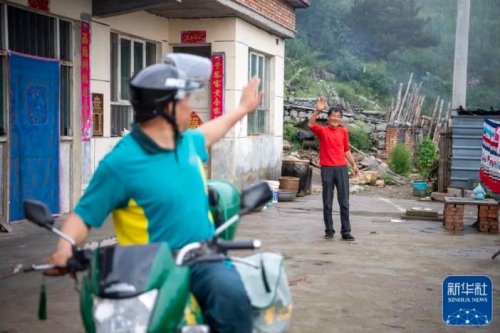 在山西省壶关县大峡谷镇壶陵水村,送件结束的赵月芳与村民挥手道别(7月13日摄)。新华社记者 杨晨光 摄
