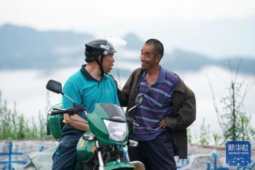在山西省壶关县大峡谷镇师家背村,赵月芳为村民送件(7月14日摄)。新华社记者 詹彦 摄