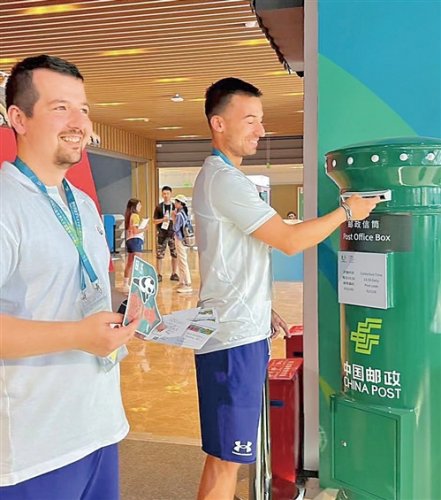 邮政工作人员向运动员细致介绍大运会文化产品。