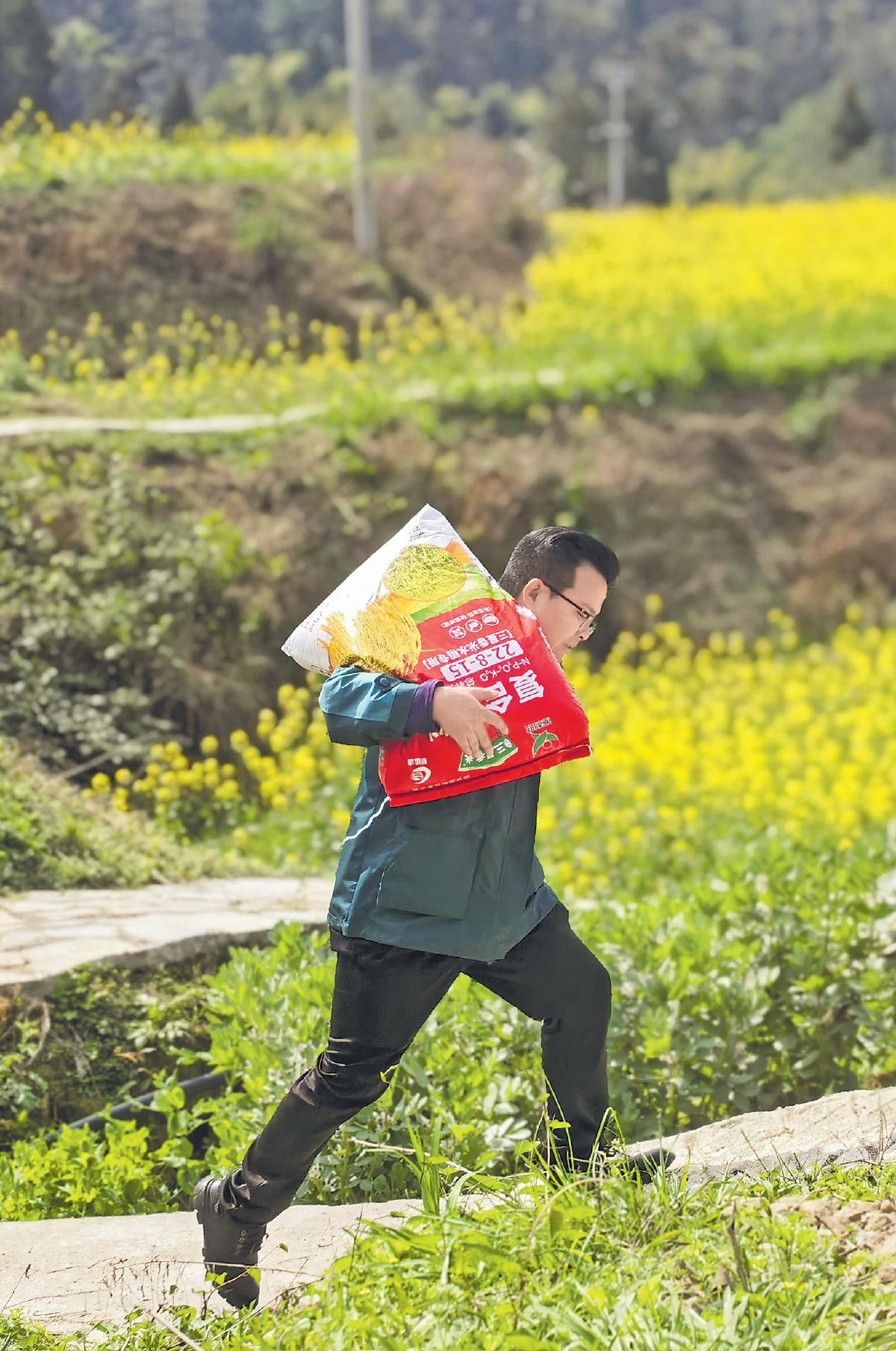 3月11日,邮政投递员奔走在田埂间,抢农时、保春耕,将农资及时送到农户手中。 □魏馨 摄