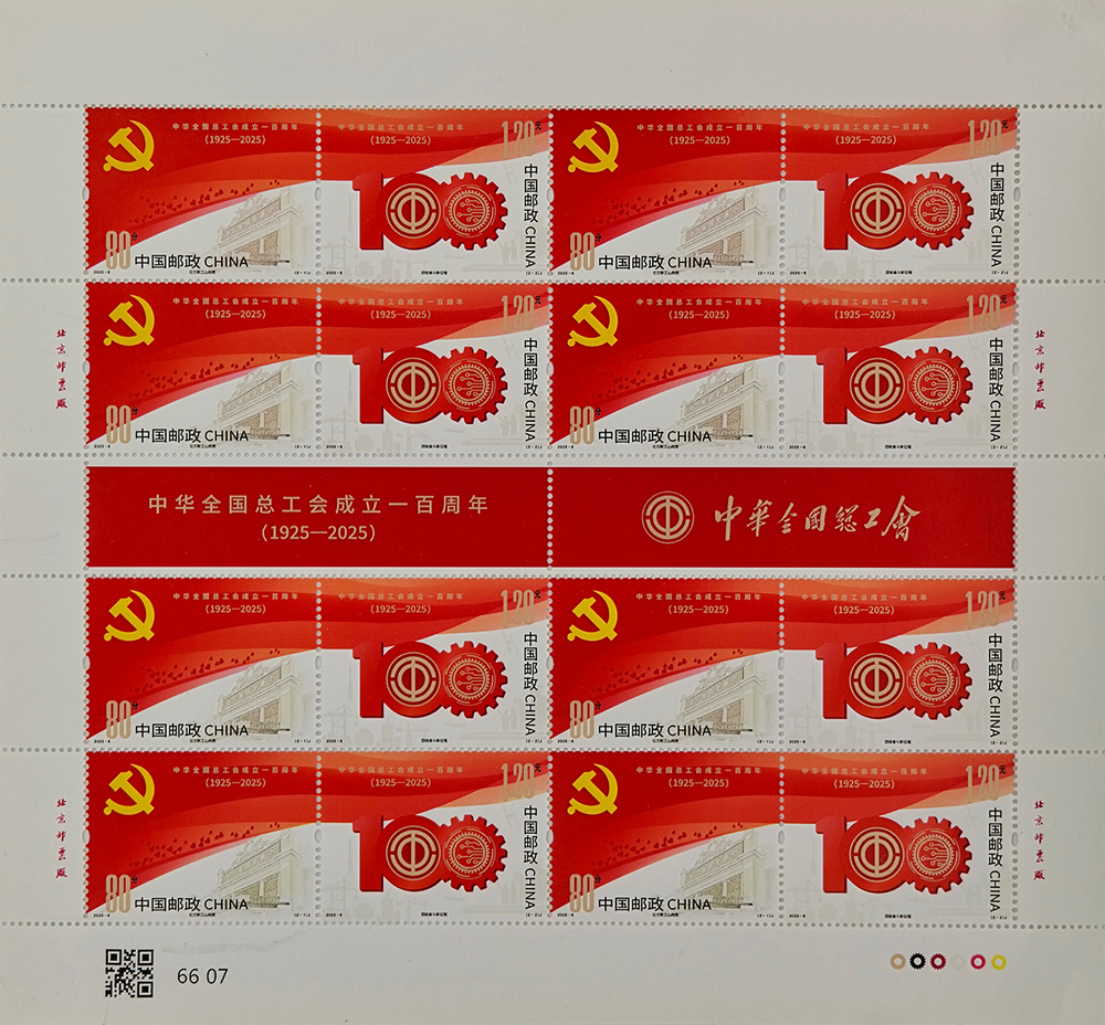 中国邮政定于2025年5月1日发行《中华全国总工会成立一百周年》纪念邮票1套2枚。详情如下: