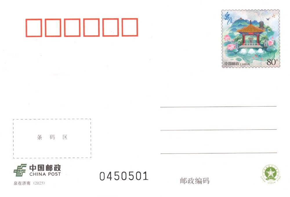 中国邮政定于2025年6月18日发行《泉在济南》普通邮资信封1枚和普通邮资明信片1枚。详情如下: