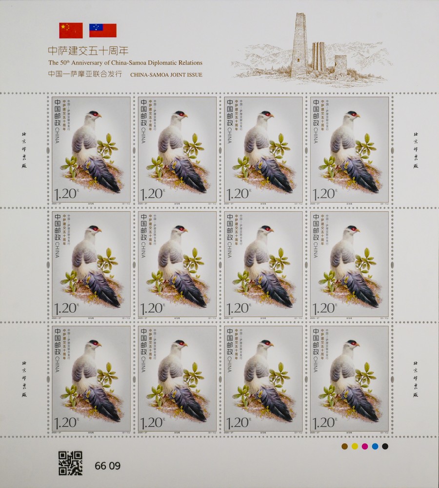 本套邮票以两国的特色鸟类为核心设计元素,融西方钢笔线条与东方淡彩的表现技法,笔触细腻传神,形象生动逼真,两只禽鸟顾盼相应、神气贯连,洋溢着蓬勃的生命力。本套邮票既展现两国独特的自然生态之美,更传递出两国友谊的深厚底蕴与美好未来。第一枚邮票表现了“白马鸡”。作为四川丹巴莫斯卡鸟类重要栖息地的主要保护物种,白马鸡也成为丹巴自然生态的鲜活代表,当地独特的高原气候、适宜的生态环境为其提供了理想生存空间。第二枚邮票表现了“齿嘴鸠”。作为萨摩亚的本土特有鸟类,齿嘴鸠不仅是当地生态系统的重要成员,更被视为萨摩亚自然与文化遗产的象征,承载着萨摩亚人民对家乡土地的热爱与珍视。